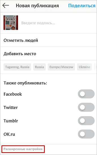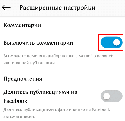 В официальном приложении “Instagram” у нас есть гораздо больше возможностей для настроек своего аккаунта и публикаций, чем в веб-версии. Например, можно полностью закрыть комментирование к конкретной записи. Для этого при добавлении фотографии нажмите на надпись “Расширенные настройки”.