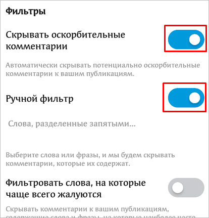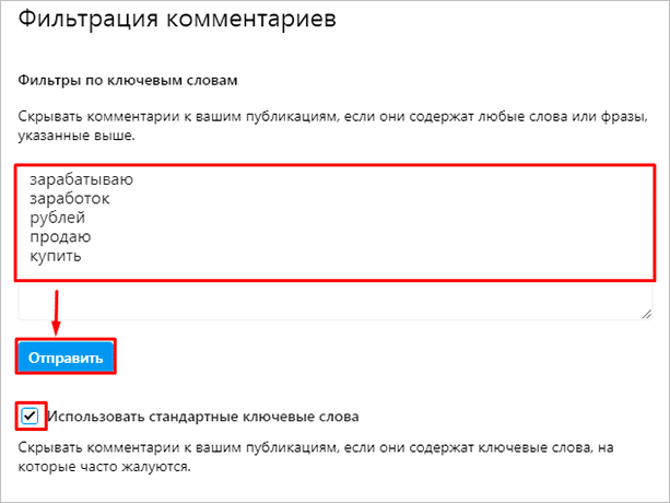 - Задать ключевые слова, которые чаще всего используют спамеры, хамы и другие малоинтересные собеседники, чтобы исключить их из числа комментаторов. Такие настройки доступны на компьютере и в телефоне.