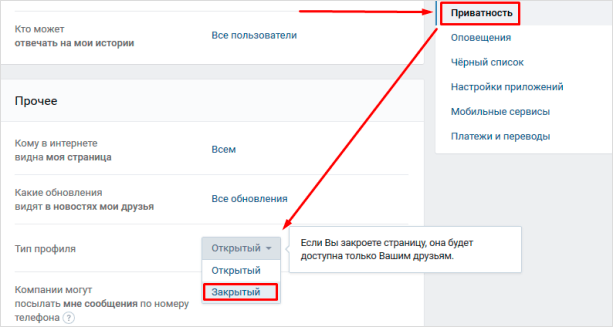Перейдите в раздел “Приватность” и пролистайте страницу в самый низ. В графе “Тип профиля” установите режим “Закрытый”.
