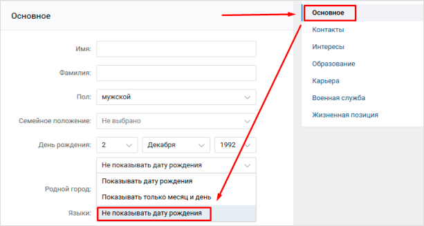 Как сделать, чтобы и эта информация не отображалась? Для этого придется стереть некоторые данные. Перейдите в раздел “Основное” на странице редактирования личных данных. Выберите “Не показывать дату рождения”. На вкладке “Контакты” уберите город вашего проживания или замените его фиктивным.
