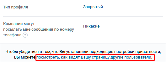 В самом низу находится текст с предложением проверить правильность настроек приватности. Кликнув на синюю надпись-ссылку, вы попадете в режим наблюдателя и увидите, как выглядит ваш аккаунт со стороны.