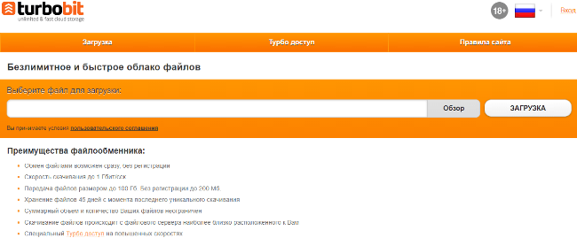 Turbobit – один из лидеров среди файлообменников. Его особенность в том, что пользователю даже не надо регистрироваться, чтобы обмениваться файлами. Правда, в этом случае загрузить можно только тот материал, который весит до 200 МБ. Зарегистрированным же участникам доступна загрузка файлов до 100 ГБ.
