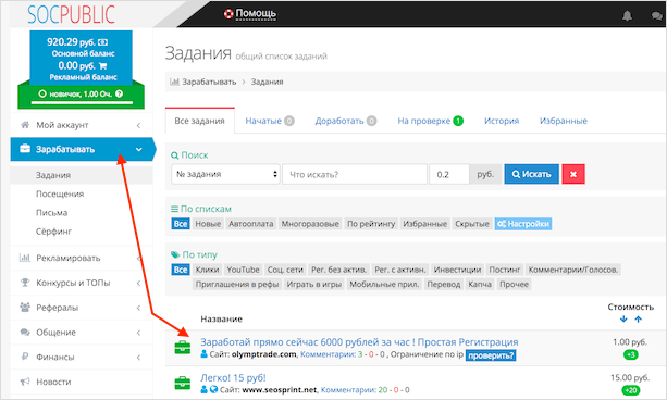 Давайте покажем вам весь процесс на примере площадки Соцпаблик. По сути, все сайты для заработка на кликах одинаковые, а некоторые даже имеют очень похожий интерфейс. Поэтому, мы думаем, будет достаточно одной инструкции.