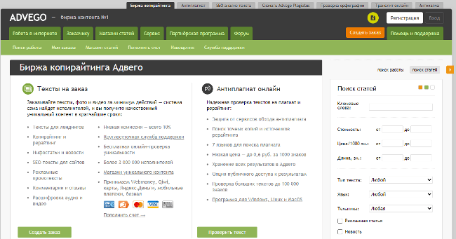 Адвего – одна из самых популярных бирж, где можно найти множество разнообразных заданий, в том числе и заказ отзывов. Плюсом является простота работы с сайтом, а также большое количество задач, но при этом пользователи могут ощутить весомую конкуренцию.