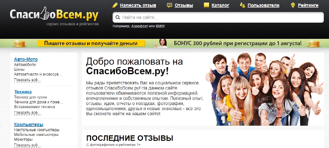 СпасибоВсем.ру – конкурент двух предыдущих сервисов, который появился немного позже своих коллег. Сервис пытается выбиться в лидеры, поэтому и выплачивает за регистрацию 300 руб.