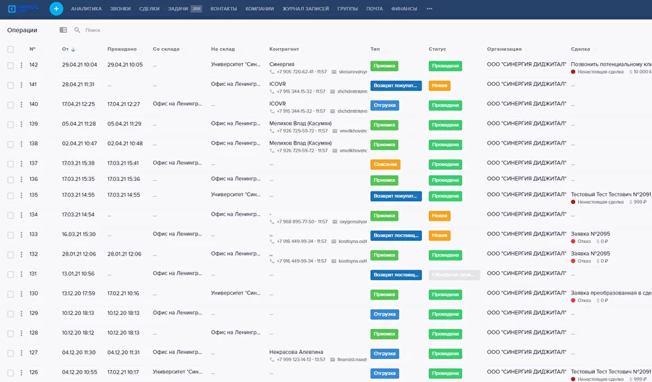 4. Телефония. Позволяет использовать встроенную телефонию для связи с клиентами и сотрудниками. Это существенно экономит время на поиск нужного контакта или набор номера, а также сокращает издержки на оплату сотовой связи. Встроенная АТС сохраняет записи разговоров, которые при необходимости можно переслушать.
