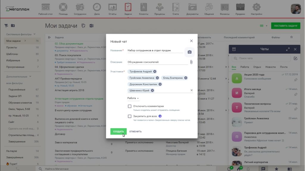 5. Чат. Мессенджер внутри CRM, чтобы в рабочее время сотрудники общались между собой в одном окне и не отвлекались на переключение вкладок. Также можно настроить внутренние видеоконференции для проведения планерок и совещаний онлайн.