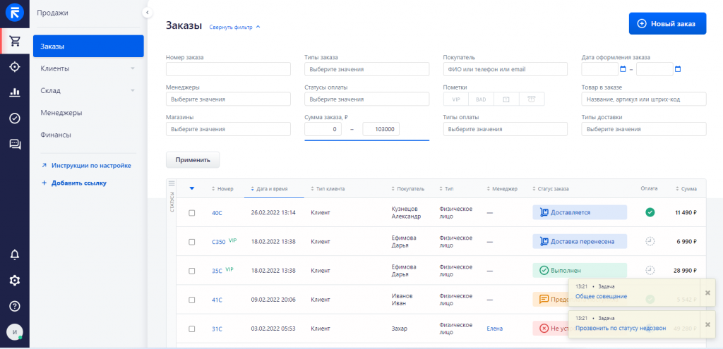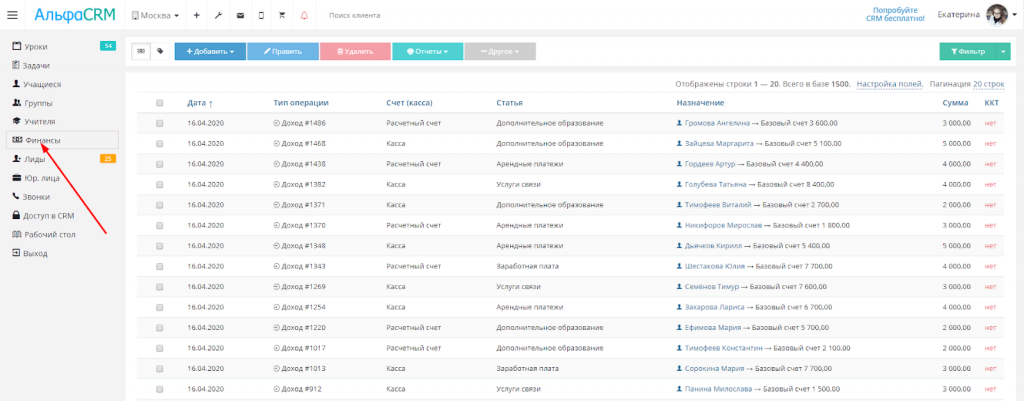 6. Финансы. Позволяет вести учет доходов и расходов, проводить платежи, формировать счета-оплаты и чеки об оплате, реализовывать возврат средств, следить за статусами оплаты заказов, начислять заработную плату сотрудникам.