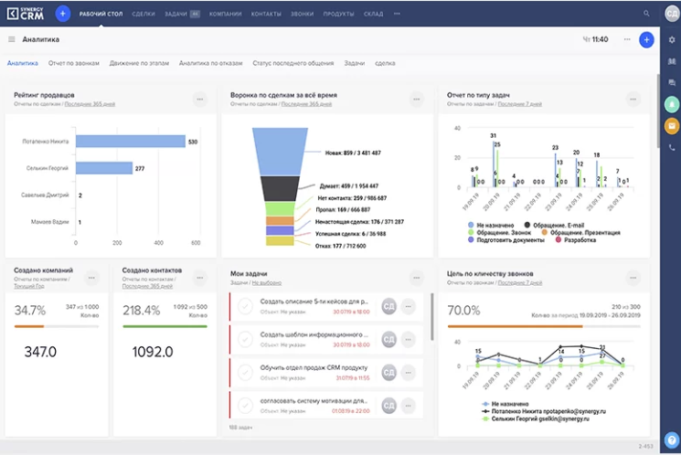 4. Аналитика. Позволяет анализировать ход продаж и работу с клиентами, формировать автоматические воронки, отчеты по проектам и задачам в режиме реального времени, проводить оценку эффективности работы сотрудников. Дает возможность вывести на рабочую область любое количество диаграмм и графиков по интересующим параметрам.