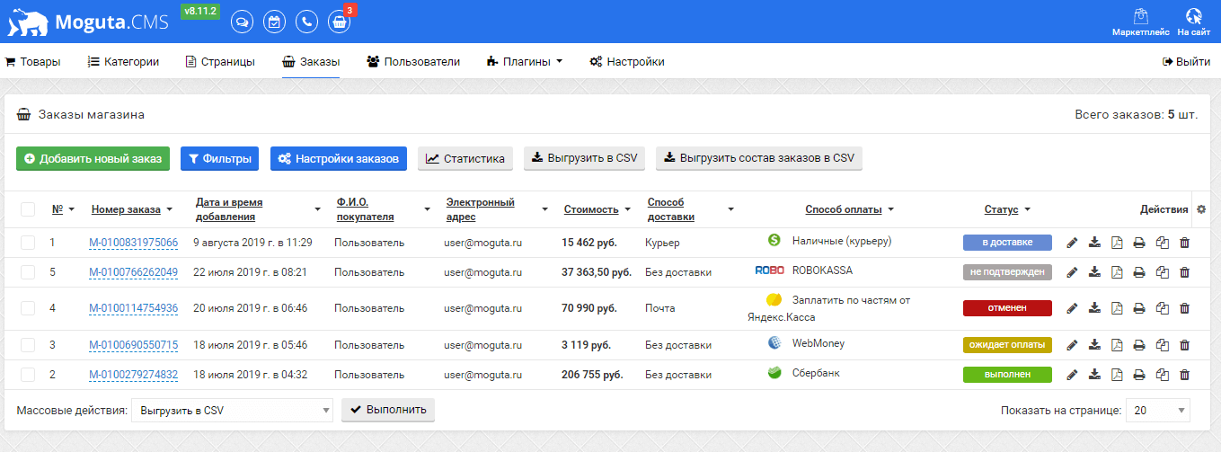 Moguta.CMS можно синхронизировать с RetailCRM, 1С и МойСклад, а также выгружать базу пользователей в MailChimp для организации массовых email-рассылок.