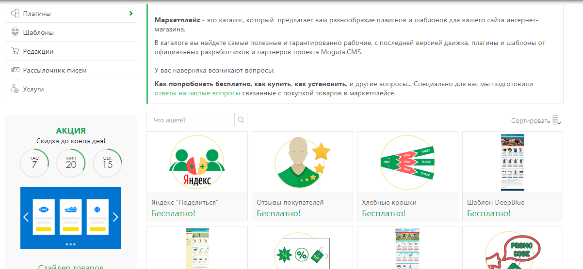 - Проведение акций. Наиболее интересны плагины для формирования скидочных промокодов, таймер акций, товар дня и рекламный баннер.