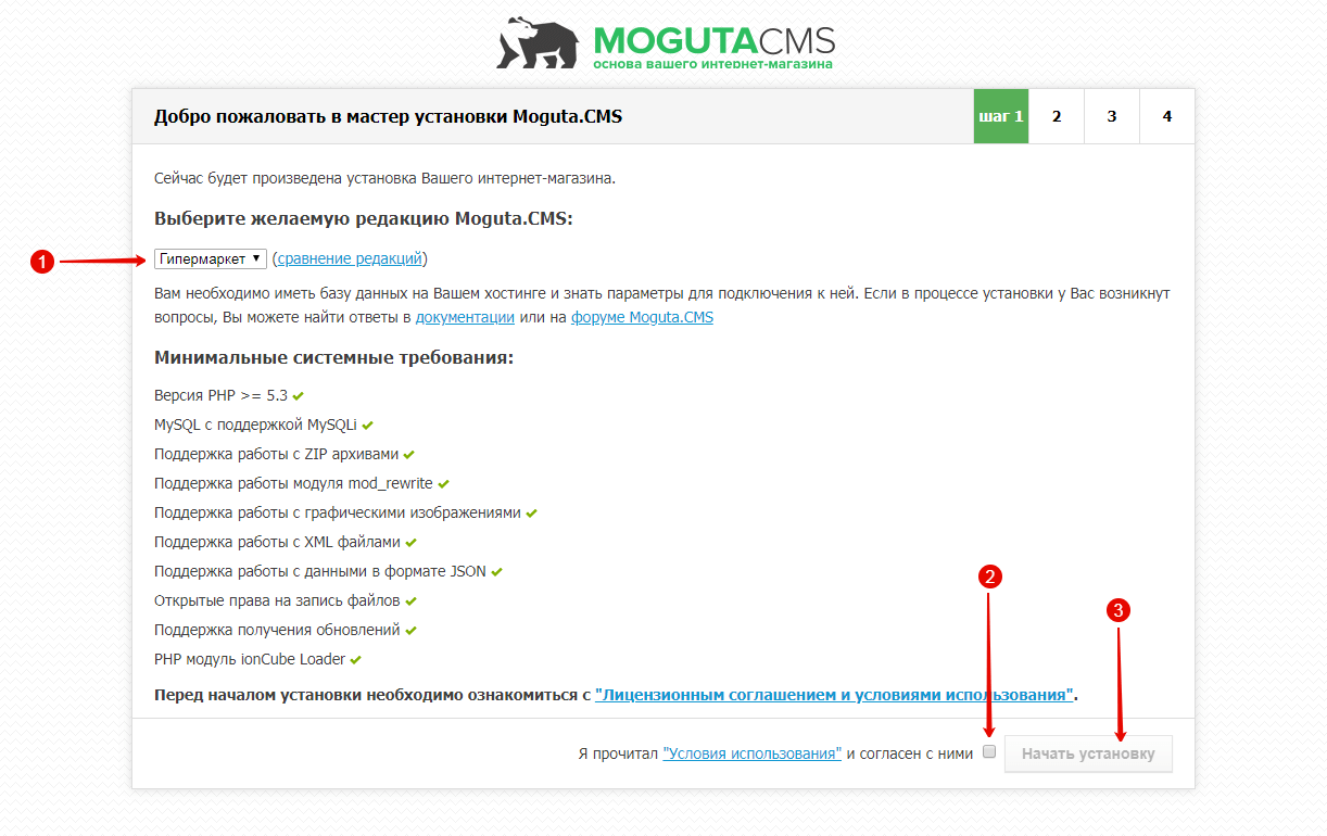 Шаг №4. Откройте свой проект в браузере, чтобы увидеть мастер установки CMS. Здесь необходимо выбрать оптимальную редакцию движка/тариф и проверить совместимость платформы с системными требованиями вашего хостинга. После этого согласитесь с условиями использования, поставив галочку, и нажмите «Начать установку».