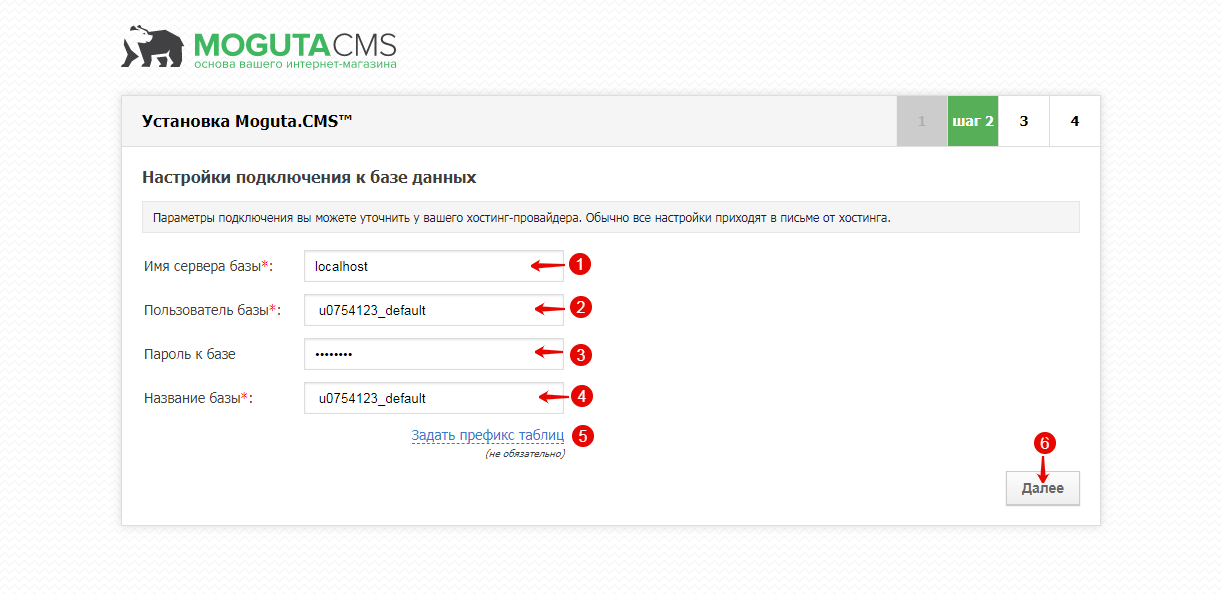 Шаг №5. Далее укажите параметры подключения базы данных сайта MySQL к серверу: