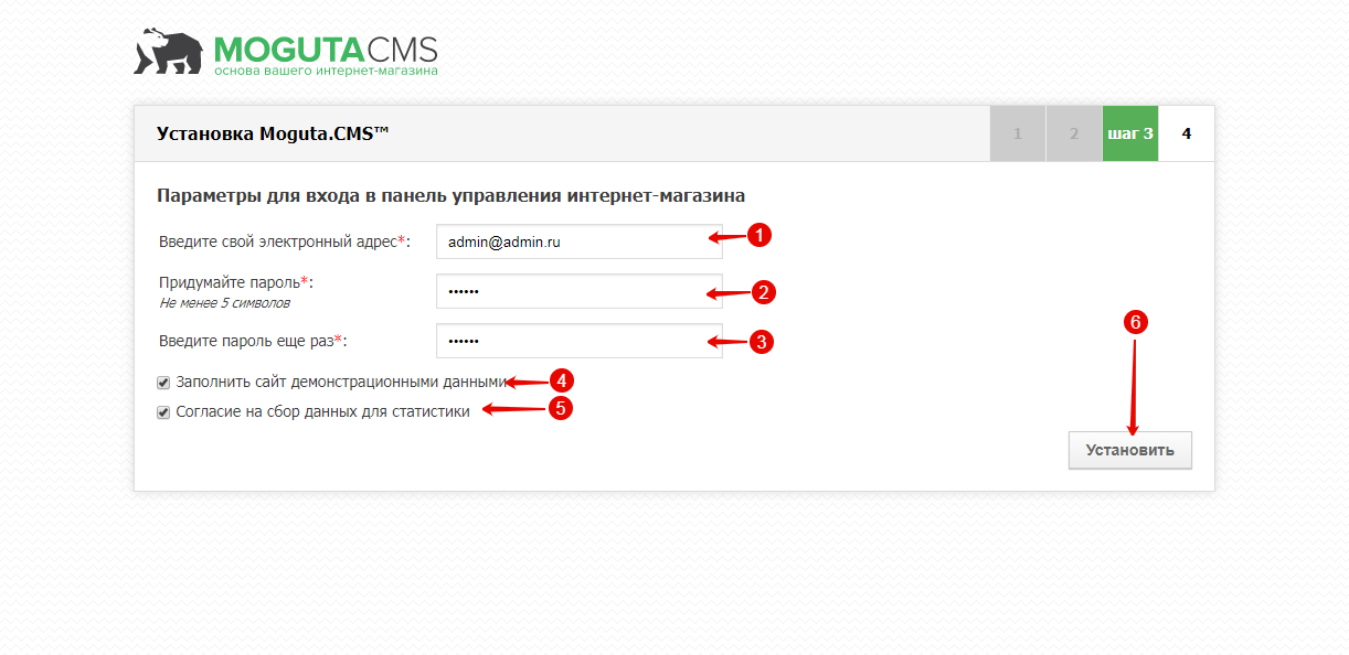 Придумайте надёжный пароль и введите его в соответствующее поле. Отметьте галочкой пункты «Заполнить сайт демонстрационными данными» и «Согласие на сбор данных для статистики».