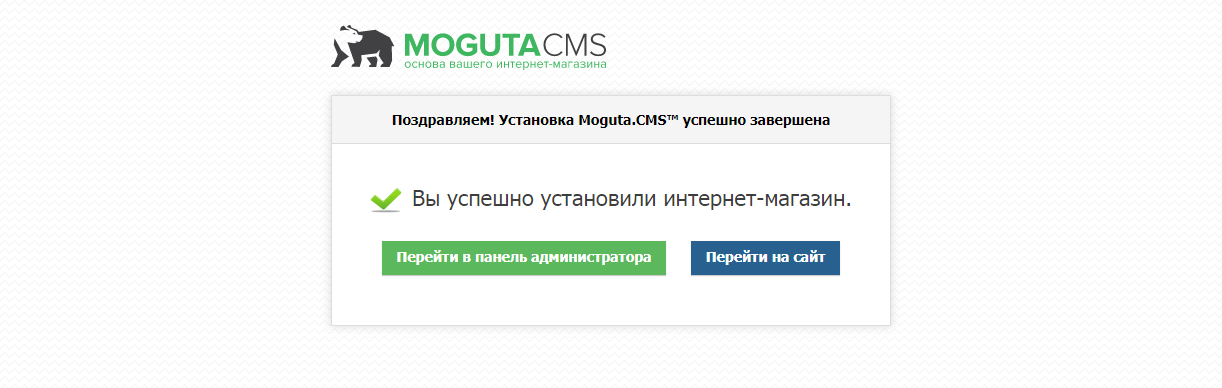 Если вы всё сделали правильно, полоса загрузки станет зелёной и появится надпись «Вы успешно установили интернет-магазин». После этого можно перейти на сайт для ознакомления с web-проектом или же в панель администратора – для его настройки.