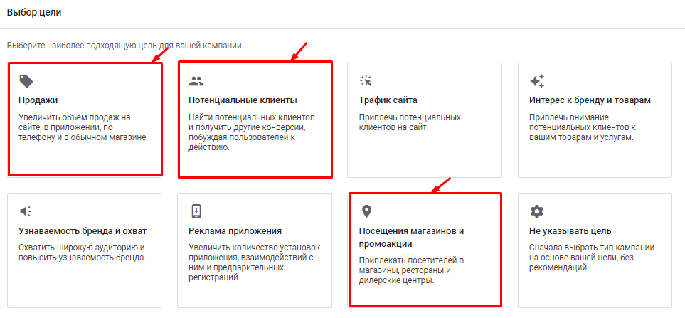 Кампания с максимальной эффективностью доступна для трех целей: «Продажи», «Потенциальные клиенты», «Посещения магазинов и промоакции».