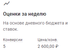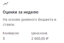 Справа в колонке отобразится прогноз по количеству конверсий и цены за конверсию. Он составляется с учетом установленного бюджета и ставок. В нашем примере за неделю прогнозируется привлечение 5 конверсий. Цена конверсии – 2 600 рублей.