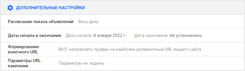 В дополнительных настройках при необходимости можно установить расписание показа объявлений, изменить дату начала кампании или указать время ее окончания, задать параметры URL кампании и сформировать конечный URL.