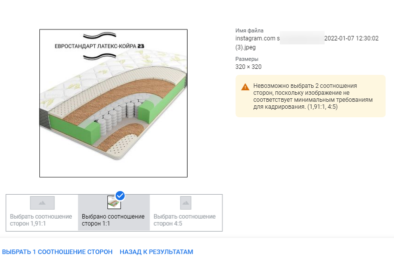 Доступные соотношения сторон: горизонтальное изображение (1,91:1), квадратное изображение (1:1), вертикальное изображение (4:5).