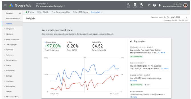 Рекламодатель может отслеживать, насколько эффективно работает автоматическая кампания. Информация о кампаниях «Максимальная эффективность» отображается в разделе «Обзор». На дашборд выносится информация о приросте конверсий, стоимости, текущем CPA.