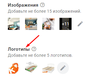 4. Добавляем логотипы. Ограничение – не более 5 логотипов. Размер логотипа подбирается в зависимости от площадки. Доступные соотношения сторон: квадратное изображение (1:1) и вертикальное изображение (4:1).