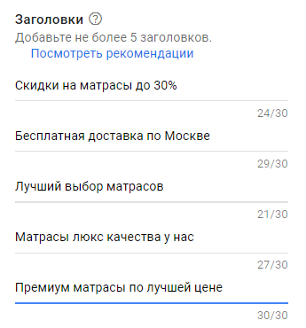 6. Пишем короткие заголовки. Всего можно добавить 5 заголовков, каждый из которых вмещает до 30 символов.