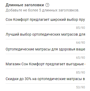 7. Указываем длинные заголовки. Ограничение – до 5 длинных заголовков, каждый из которых вмещает до 90 символов.