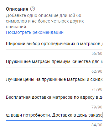 8. Добавляем описания. Всего можно добавить 5 описаний. Первое описание – до 60 символов. Остальные четыре описания – до 90 символов.