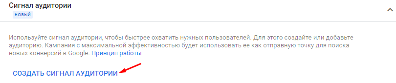 Для настройки сигнала аудитории кликаем на «Создать сигнал аудитории».