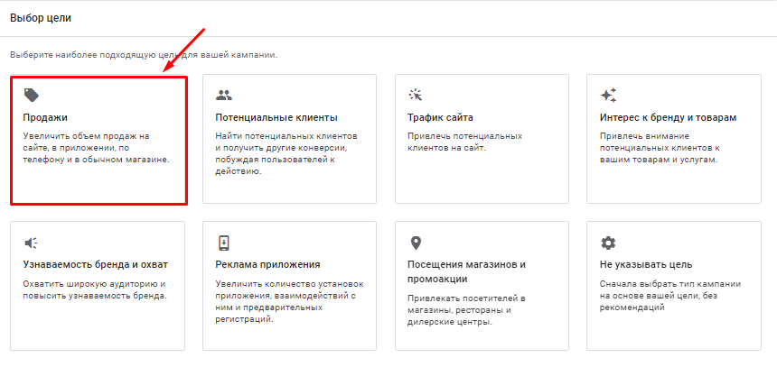 В рекламном кабинете Google Ads добавляем кампанию с целью «Продажи»: