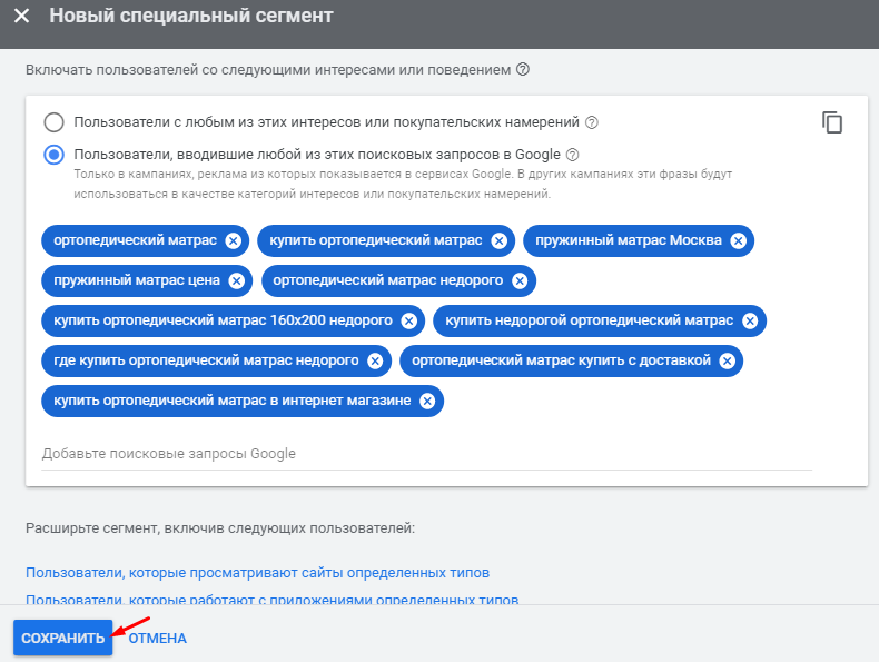 Настроим сегмент на людей, которые искали на поиске информацию о пружинных матрасах и выражали намерение его купить: