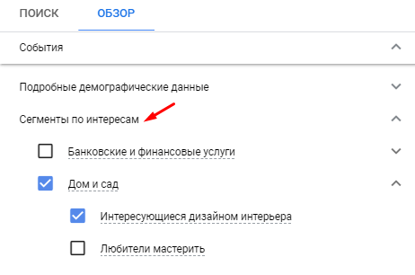 Настроим сегменты по интересам. Таргетируемся на людей, которые интересуются обустройством дома: