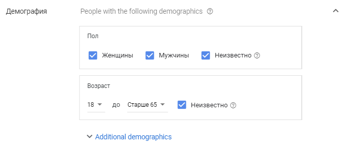5. Задаем демографический таргетинг. Система рекомендует не менять настройки демографии, чтобы не сужать аудиторию. Поэтому мы оставляем настройку без изменения.