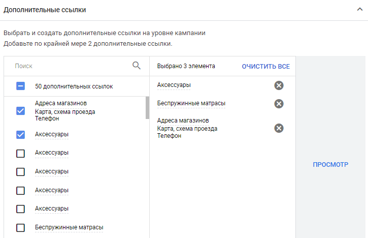 - дополнительные ссылки. Это позволит пользователям переходить на другие целевые страницы сайта с объявления.