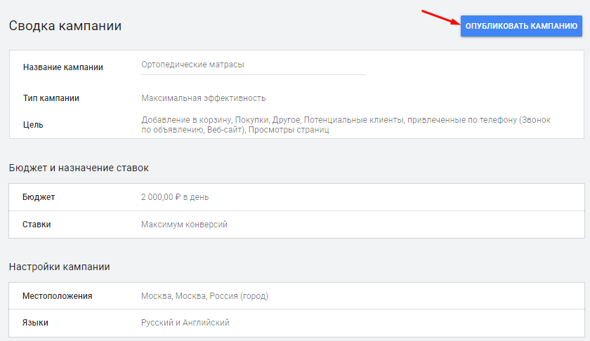 Если все данные заполнены релевантно, то остается кликнуть на кнопку «Опубликовать кампанию»: