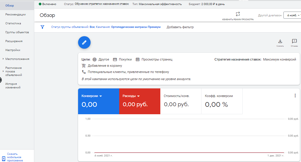 После запуска в разделе «Обзор» будут показываться данные по кампании «Максимальная эффективность»: