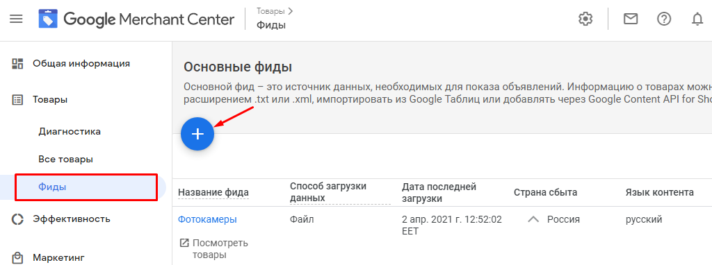 Заходим в аккаунт Merchant Center. В меню в разделе «Товары» выбираем «Фиды» и нажимаем на знак «+»: