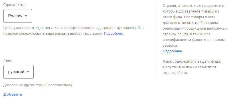 Вносим основные сведения о фиде: указываем страну сбыта и язык.