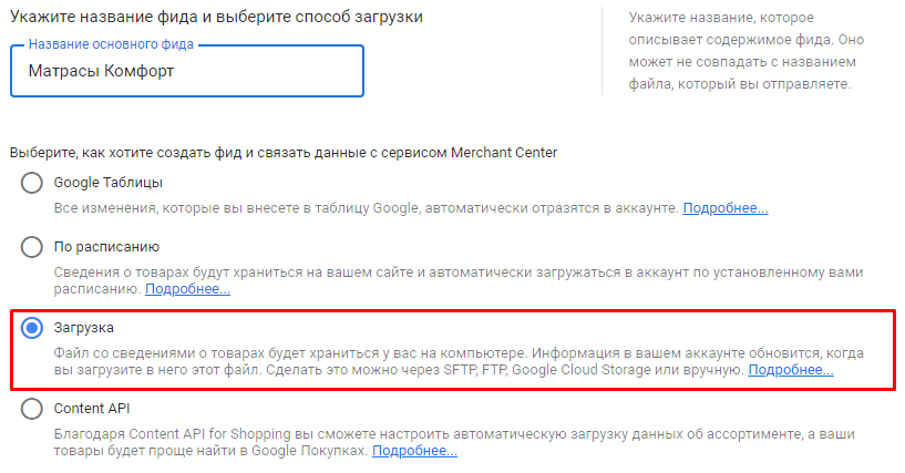 Указываем способ загрузки. Мы создали фид с помощью онлайн-генератора фида из YML. Поэтому в настройках указываем способ «Загрузка»: