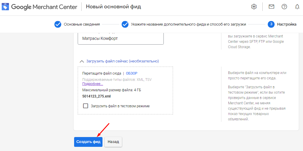 Загружаем файл в Merchant Center.