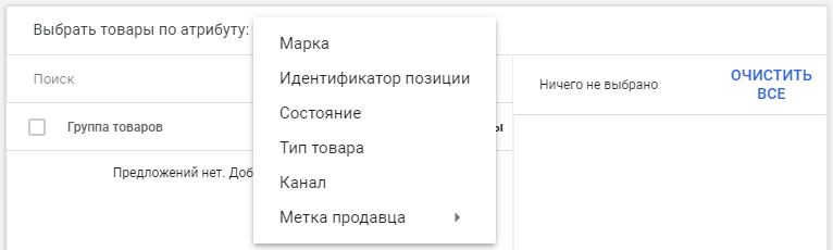 Затем определяем, по какому параметру хотим выбрать товары. Можно выбрать по марке, идентификатору позиции, состоянию, типу товара, каналу, метке продавца.