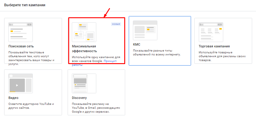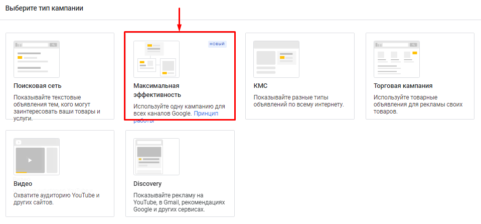 Выбираем тип кампании – «Максимальная эффективность»: