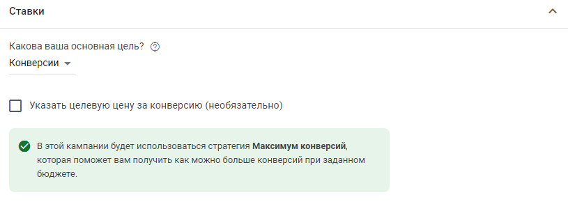 - «Конверсии». При подключении этой цели будет применяться стратегия «Максимум конверсий». Она работает на получение максимального количества конверсий в рамках заданного бюджета. При необходимости можно задать целевую цену за конверсию.