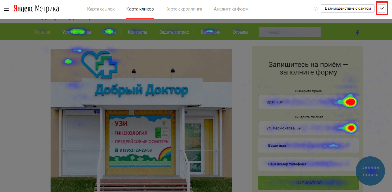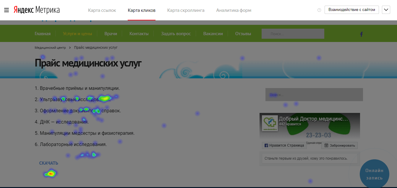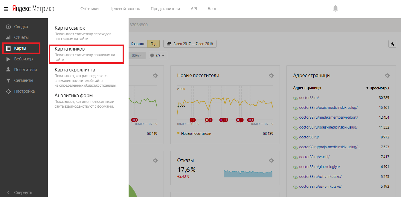 Улучшить юзабилити сайта и досконально проанализировать поведение пользователей помогут «Карты» Яндекс.Метрики. Этот инструмент формирует четыре вида отчётов: статистику по кликам, скроллингу страниц, переходам по ссылкам и взаимодействию посетителей с формами. Для получения расширенной статистики необходимо указать в счётчике Яндекс.Метрики параметр «Вебвизор, карта скроллинга, аналитика форм». Сервис начнёт собирать данные в течение получаса после установки счётчика.