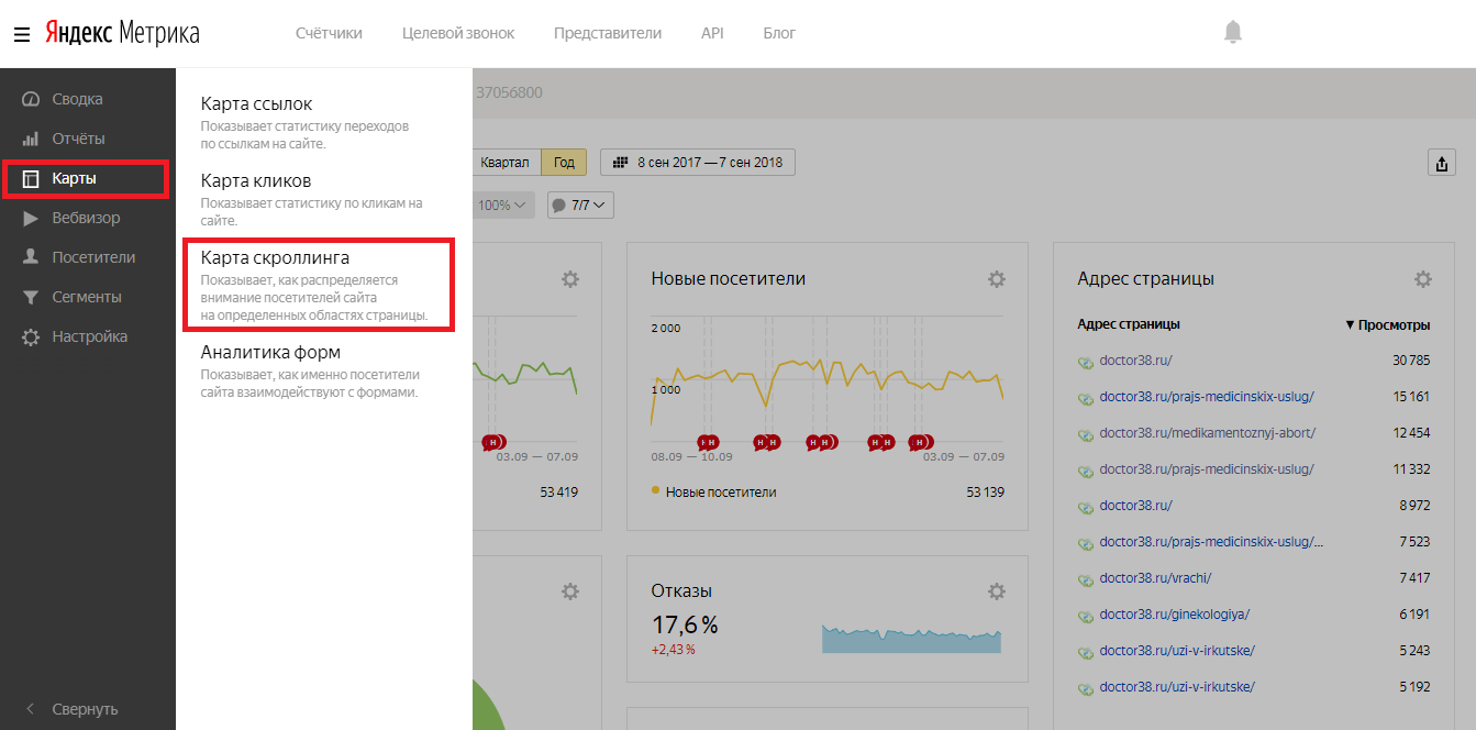 Карты скроллинга показывают распределение внимания пользователей на разных областях страниц ресурса. С их помощью легко определить оптимальную длину страниц, правильно разместив на них важные элементы. Чтобы посмотреть карту скроллинга, нужно в меню выбрать пункт «Карты» и кликнуть по разделу «Карта скроллинга».