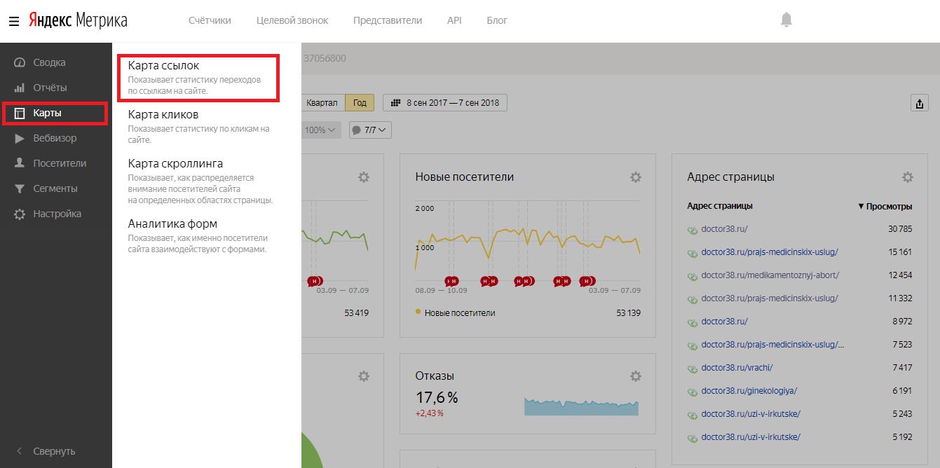 Чтобы посмотреть карту ссылок, следует в меню счётчика кликнуть по пунктам «Карты» — «Карта ссылок».