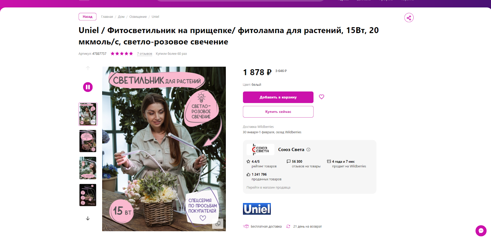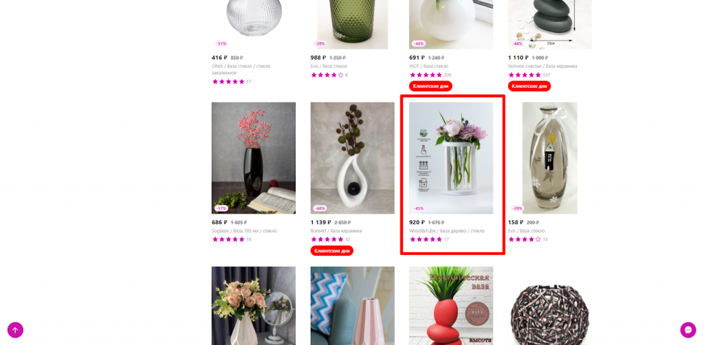 На примере главные достоинства предложения плохо различимы на изображении, их возможно прочитать, только если перейти в карточку. Из-за этого ваза теряется на фоне остальных.