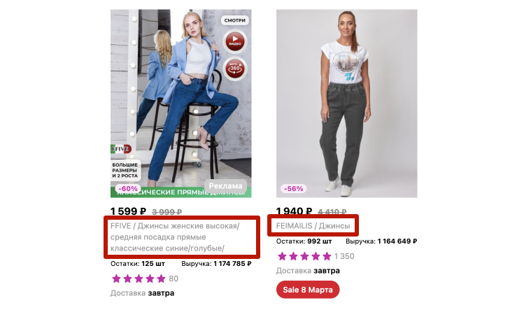 Этот элемент играет такую же важную роль, как и карточка в целом: именно по наименованию пользователь ищет на маркетплейсе то, что ему необходимо. Название влияет на многие факторы: например, к какой категории относится продукт и с помощью каких ключевых запросов можно его найти.