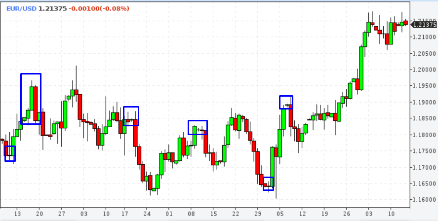 Бывает так, что очередная свеча полностью «поглощает» предыдущую – это признак начала сильной тенденции. Бывает, что у свечи почти нет тела – это сигнал о том, что рынок готов развернуться. На дневном графике EUR/USD мы насчитали пять таких свечей и выделил их синими прямоугольниками – после них рынок всегда шел в обратную сторону.