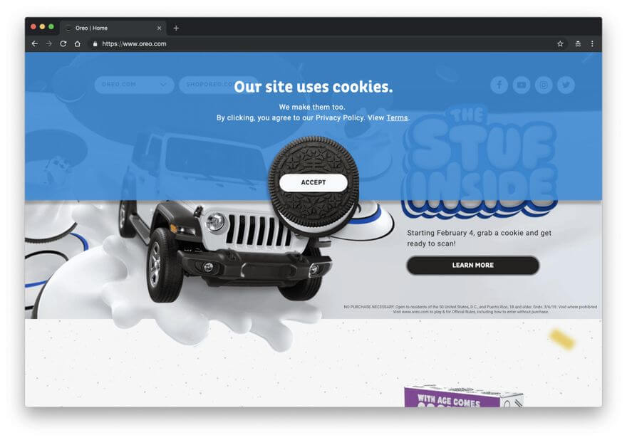 «Наш сайт использует cookies», всплывающее окно на сайте oreo.com